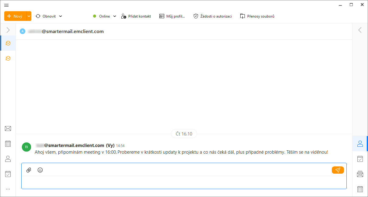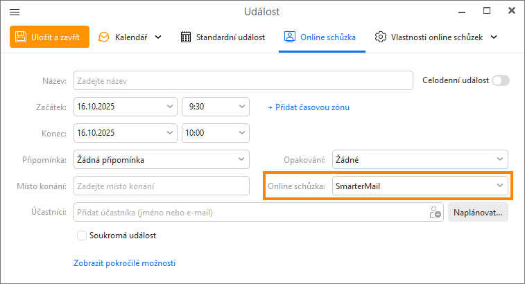 eM Client podporuje službu SmarterMail Online meetings, takže si snadno vytvoříte online schůzku přímo v aplikaci. eM Client pak automaticky přidá odkaz na SmarterMail Online schůzku do vytvořené události v kalendáři. Nemusíte tak přepínat do webového rozhraní SmarterMail.