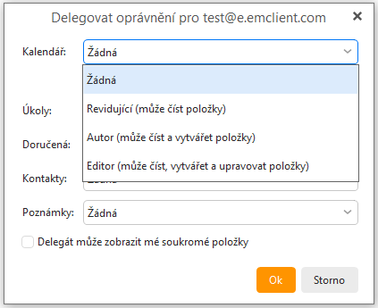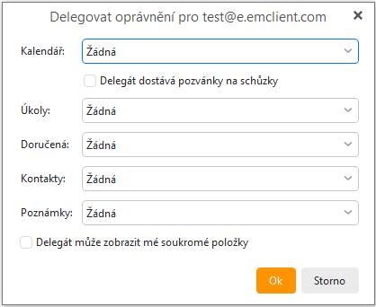 Po kliknutí na „OK“ můžete upravit nastavení oprávnění. Přístup k delegovanému účtu můžete omezit tak, že povolíte jen čtení, vytváření nebo úpravu položek nebo jakoukoli jejich kombinaci: