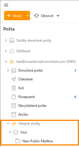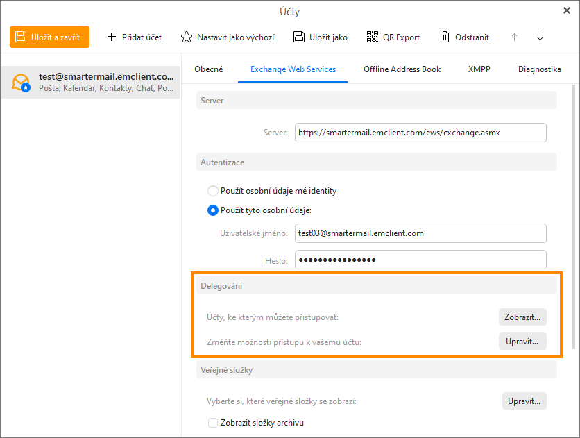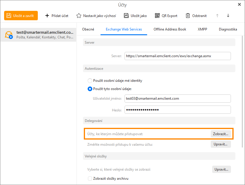 V případě Exchange účtů nastavených prostřednictvím protokolu EWS můžete uživatelům umožnit v aplikaci eM Client delegaci přístupu k účtům SmarterMail nebo přístup k veřejným složkám. To se hodí při spolupráci v týmu, nebo když vás během vaší nepřítomnosti zastupuje kolega.