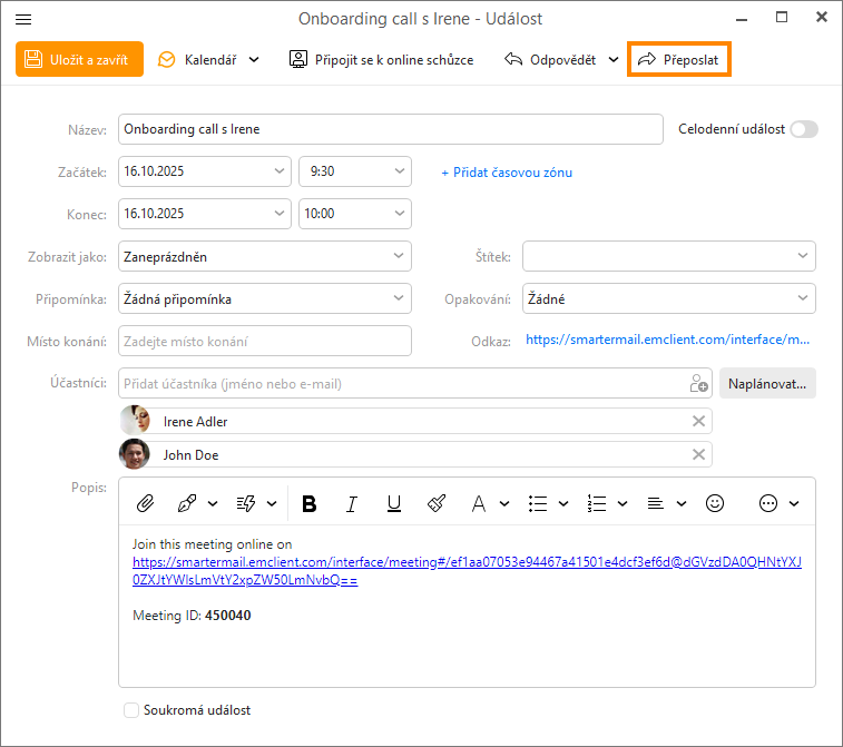 Pozvánky lze také přeposlat dalším lidem, aby je organizátor nemusel zvát ručně: