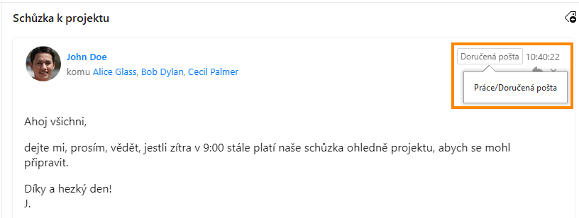Bez ohledu na to, jaké nastavení Konverzací zrovna používáte, uvidíte pole složky v pravém horním rohu hlavičky detailu zprávy. Když na něj najedete myší, zobrazí se úplná cesta ke zprávě: