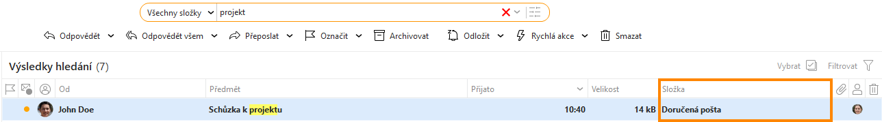 Pokud máte nastavené rozvržení „Panel zpráv dole“ nebo „Panel zpráv vypnut“, zobrazí se informace o tom, kde se zpráva nachází přímo v seznamu zpráv, a to ve sloupci „Složka“. To se hodí obzvlášť pokud je vyhledávání nastaveno na rozsah „Všechny složky“: