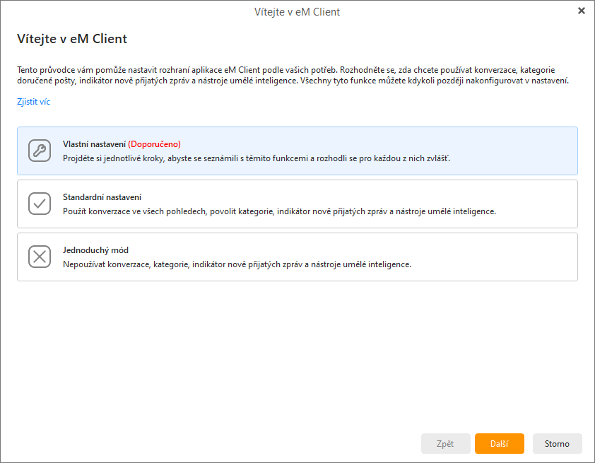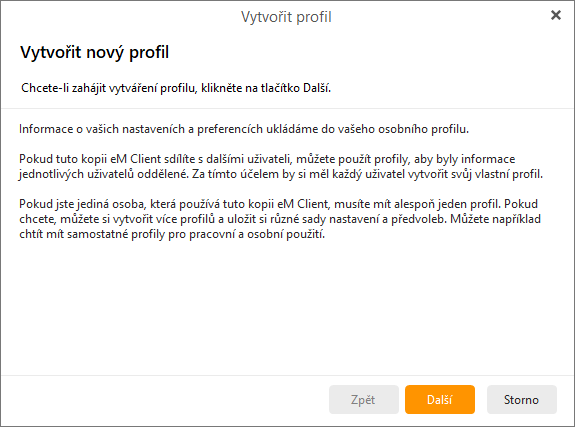 Pokud byla složka profilu nově vytvořená (nebo pokud je prázdná), otevře se při jeho spuštění průvodce nastavením - stejně jako při první instalaci aplikace eM Client: