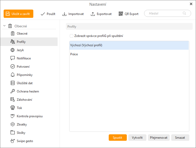 V sekci Nastavení > Obecné > Profily můžete zobrazit a spravovat existující profily, nebo nový profil vytvořit.