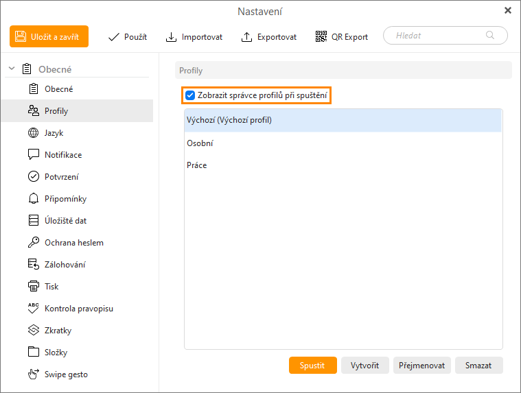 Pokud chcete správce profilů vidět při každém spuštění aplikace, zapněte možnost „Zobrazit správce profilů při spuštění“ v Nastavení > Obecné > Profily.