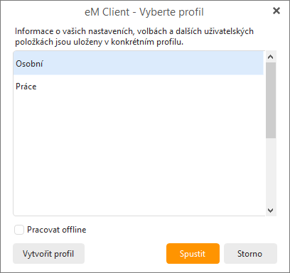 V takovém případě se ukáže okno pro výběr profilu při každém startu aplikace. Vyskakovací okno nabízí také možnost spuštění vybraného profilu v režimu offline: