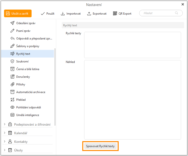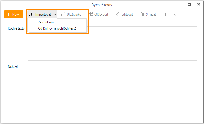 Rychlé texty nemusíte vytvářet od nuly - klikněte na tlačítko Importovat a importujte Rychlé texty ze souboru (.html, .htm), nebo je zkuste importovat z naší knihovny Rychlých textů: