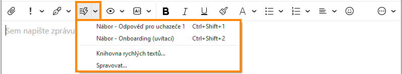 Při psaní nové zprávy lze Rychlé texty vkládat pomocí tlačítka Rychlý text na panelu nástrojů: