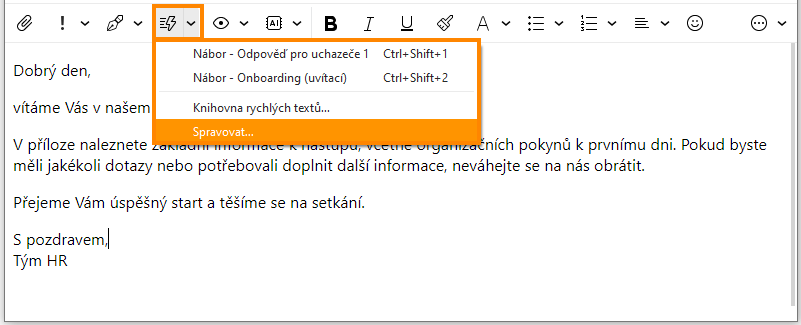 Při psaní zprávy vás možná napadne, že stejný text budete potřebovat znovu. Pro takové případy se hodí, že správce Rychlých textů je dostupný i z panelu nástrojů okna pro psaní nové zprávy. Stačí kliknout na ikonu Rychlý text a vybrat možnost Spravovat. Pak můžete pohodlně vytvořit nový Rychlý text.