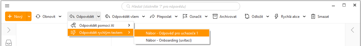 Funkce je snadno přístupná přes kontextové menu tlačítka Odpovědět na panelu nástrojů hlavního okna a u každé zprávy. Klikněte na ikonu šipky a vyberte Odpovědět rychlým textem - poté můžete zvolit, který Rychlý text chcete použít: